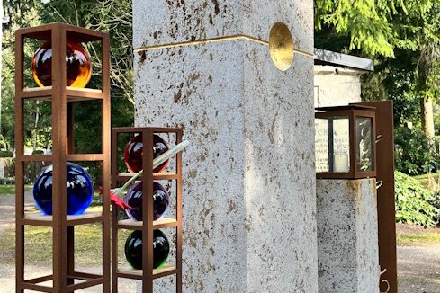 Mehrere Stelen aus Cortenstahl nehmen die bunten Glaskugeln mit den Namen der Sternenkinder auf. Jeweils acht oder sechs Kugeln mit Abstandshaltern aus Eichenholz sind diebstahlsicher in den Stelen verschlossen. Die Stelen für die Namenskugeln können von oben befüllt werden. Die Befüllung kann im Rahmen der Zur-Ruhe-Bettung als Ritual in die Abschiedszeremonie eingebaut werden.