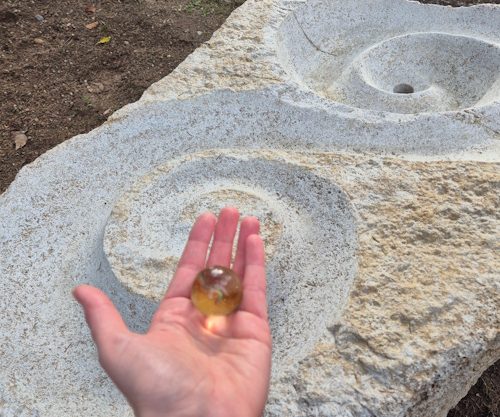 Auf einem Teil der neuen Sternenkinder-Grabstätte liegt ein allseits bruchrauer Findling aus Muschelkalk, in den eine Murmelbahn eingearbeitet ist. Dort können Geschwister von Sternenkindern auf ihre ganz eigene Art Verbindungen zur Namenskugel und zu ihrem verstorbenen Geschwisterchen herstellen. Oder einfach nur spielen.